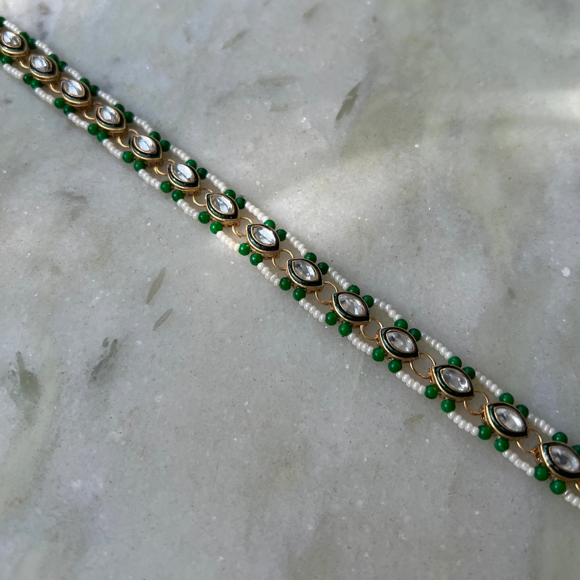 Green Rajasthani Mathapatti Sheeshphool for the head accessory to style with traditional looks.