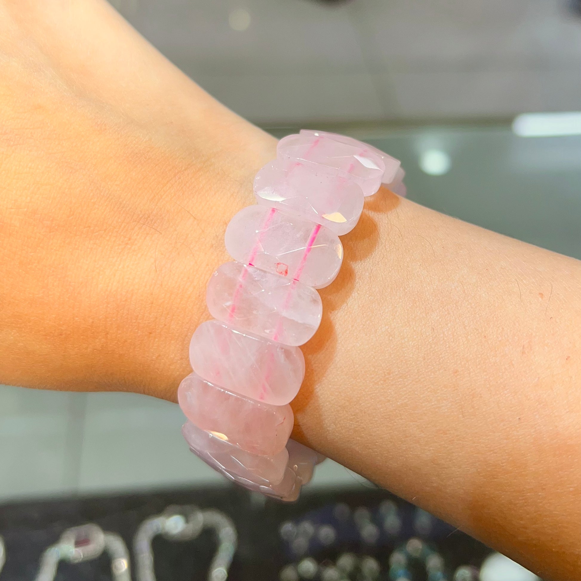 Pink Rose Quartz Crystal Tumble Oval Shape Faceted Bracelet Benefits in promoting SELF LOVE as it works with the heart chakra. It helps nurture your desires and heal relationship wounds, emotional wounds, fears and resentment. Circulates a Divine loving energy throughout the entire aura.