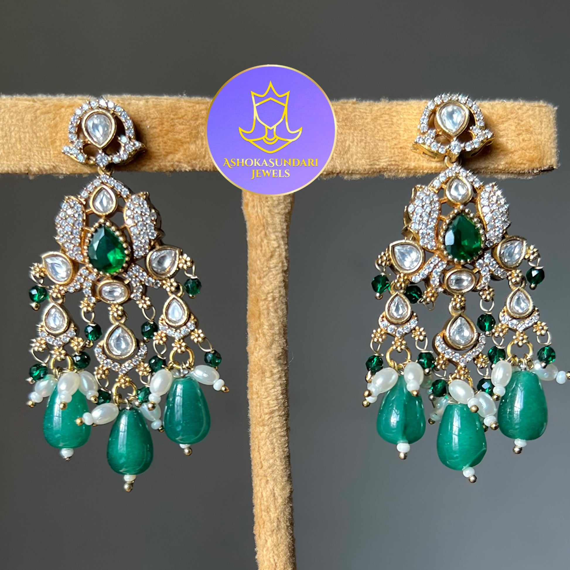 Emerald Green Amethyst Purple White Kundan Polki Foiled Statement 100% Pure Brass White Stone Moissanite Diamond lookalike Designer Earrings. Festive Bridal Look Indian Traditional Jewellery handcrafted by highly trained Indian Artisans. Best Kundan Polki Hanging Earrings designs crafted in Antique Gold Matt Dull Look finish.