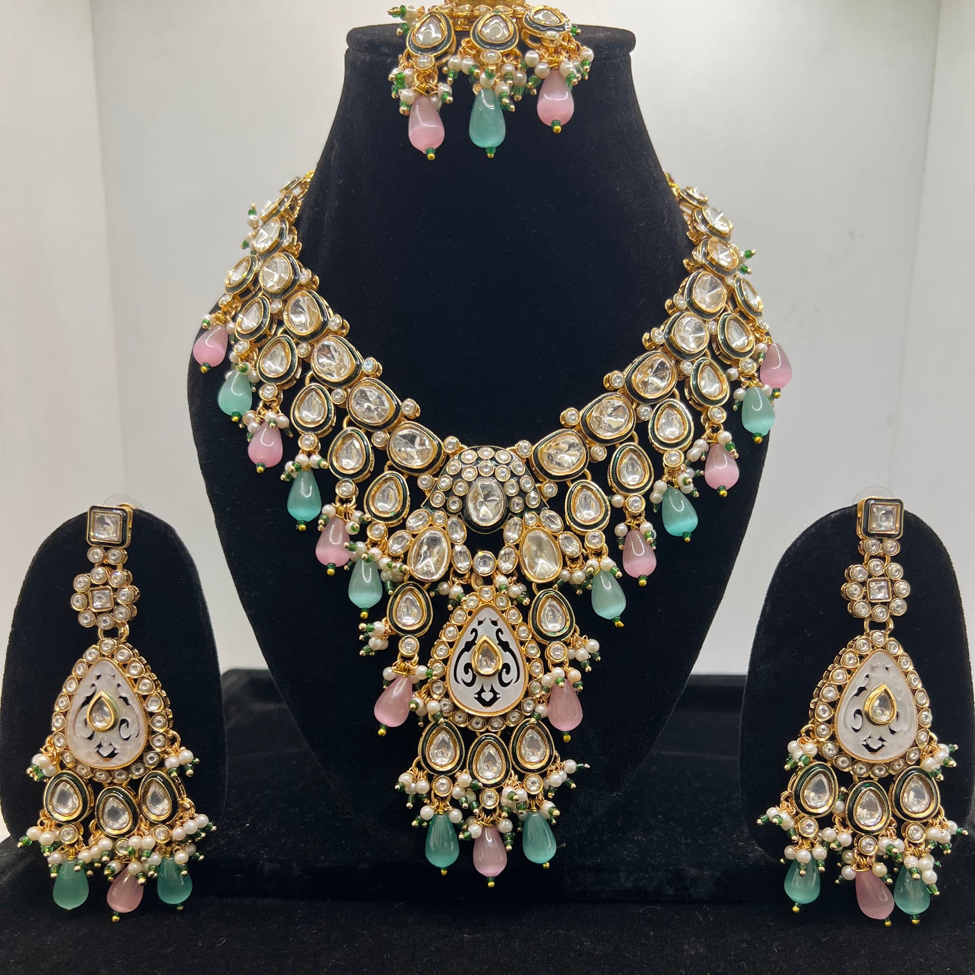 Pink Blue Firoza Pearl Stone Double Line Kundan Polki Foiled Statement 100% Pure Brass White Stone Moissanite Diamond lookalike Designer Set with Earrings. Festive Bridal Look Indian Traditional Jewellery handcrafted by highly trained Indian Artisans. Best Kundan Uncut Polki Hanging Earrings designs crafted in Antique Gold Matt Dull Look finish.